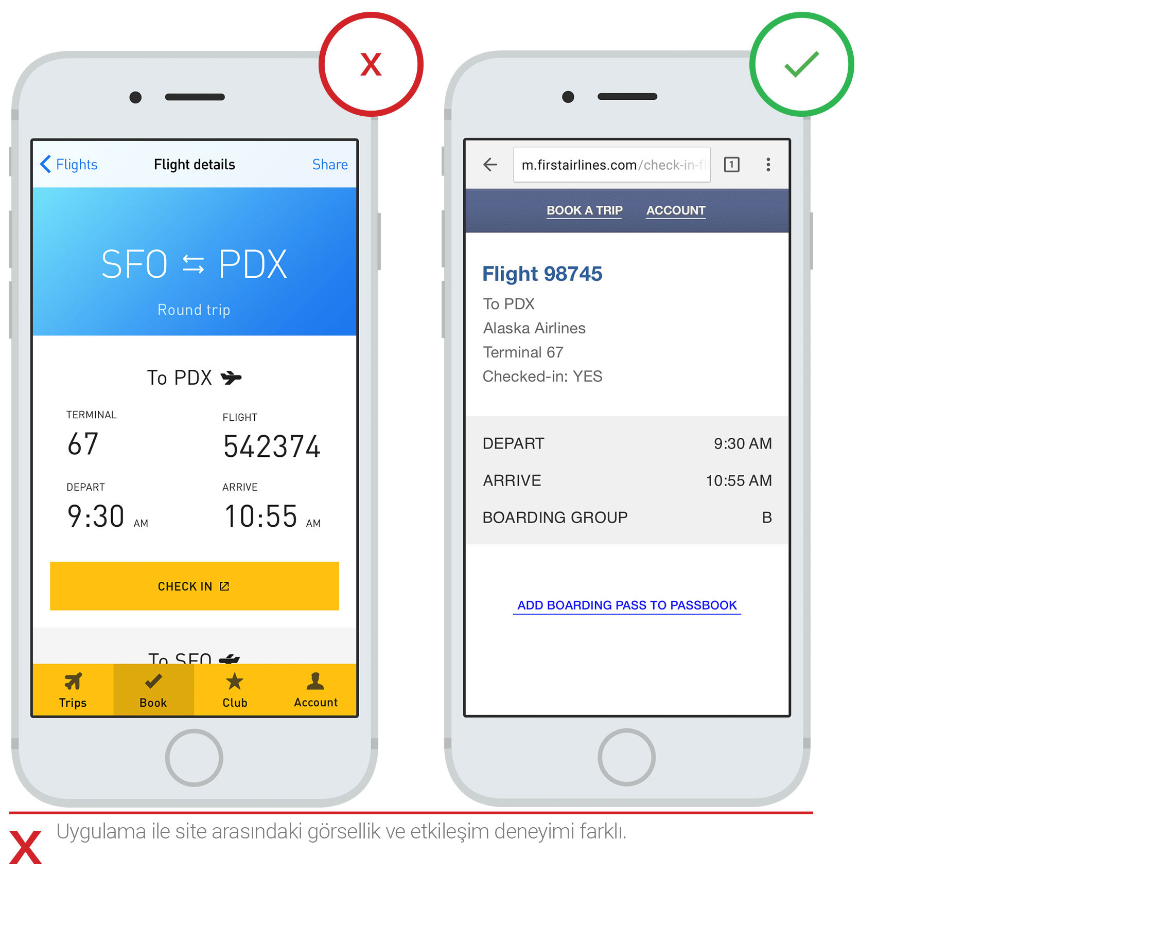 Uygulamanın daha fazla içeriğe ulaşmak veya bir eylemi tamamlamak için kullanıcıları mobil web'e götürmesi kullanıcılar için olumsuz bir deneyim olabilir. Örnek olarak; iki platformun görünümünün, hissinin ve tasarımının farklı olması kafa karıştırıcı olabilir. Aynı zamanda, geçiş sürelerinin uzun olması ve kullanıcının web sayfasının yüklenmesini beklemek zorunda kalması da sorun teşkil edebilir. Kullanıcının mobil web'e geçiş yapması şartsa, bu geçişi desteklemek için tutarlı bir tasarım yaptığınızdan emin olun. Geçişin hızlı olmasını sağlamak da tercih edilebilir ve yavaşlığın neden olacağı olumsuz etkiyi ortadan kaldırması açısından oldukça değerlidir.
